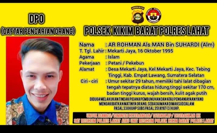 Lahat—, Sampai hari ini Tersangka atas nama Ar Rohman alias Man Bin Suhardi (Alm) belum diketahui kerberadaannya, bagi masyarakat Lahat maupun diluar daerah Lahat jika mengetahui keberadaan orang tersebut segera menghubungi pihak yang berwenang terdekat.